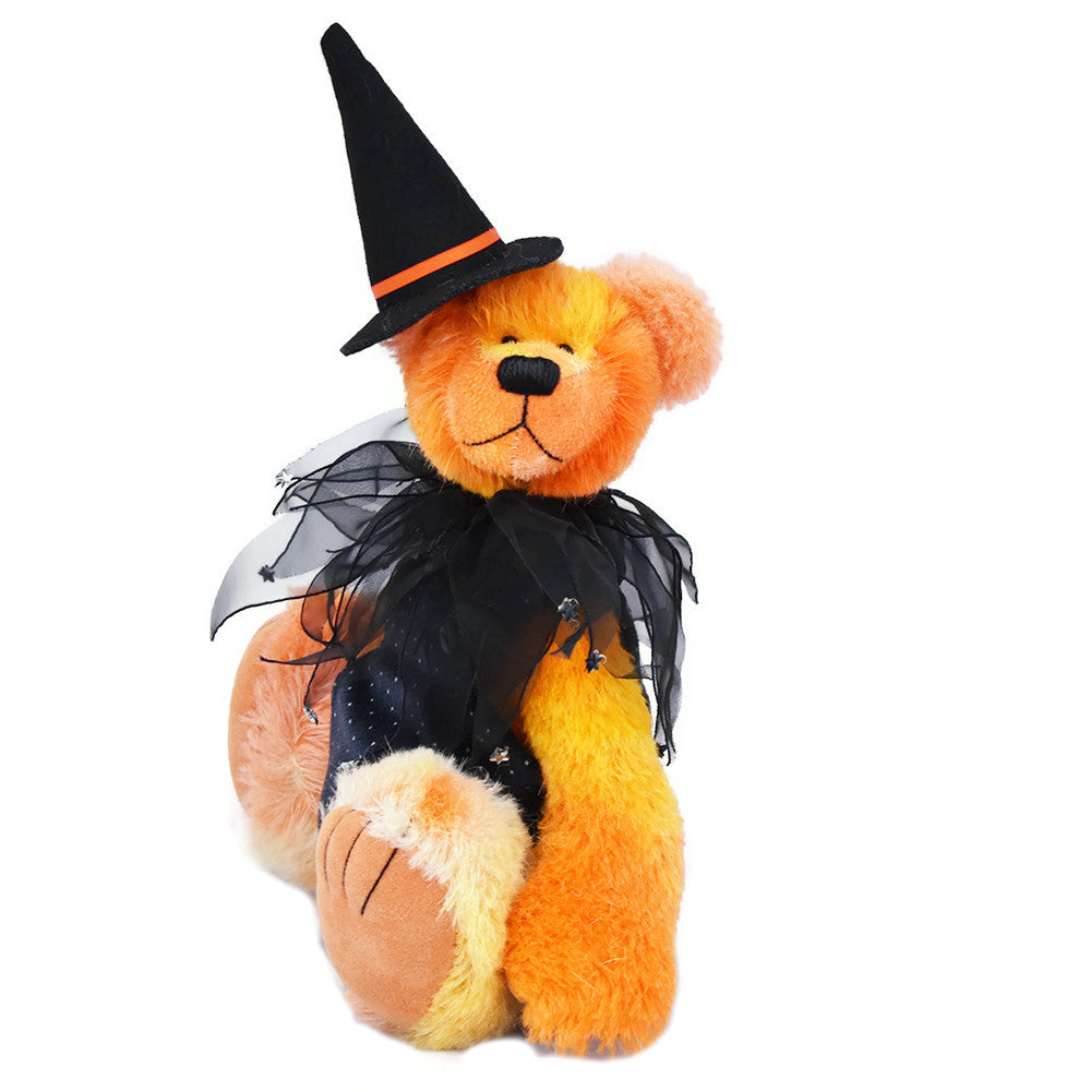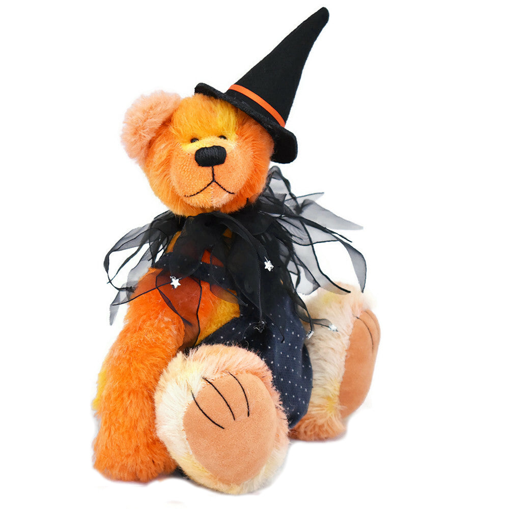 Handmade hand dyed orange German mohair teddy bear, suedette paw pads, black glass eyes, black perle cotton stitched and waxed nose, cotter pin joints, filled with polyester and a little steel shot. Free standing. Needlecord dungarees, black organza ruffe and felt hat..