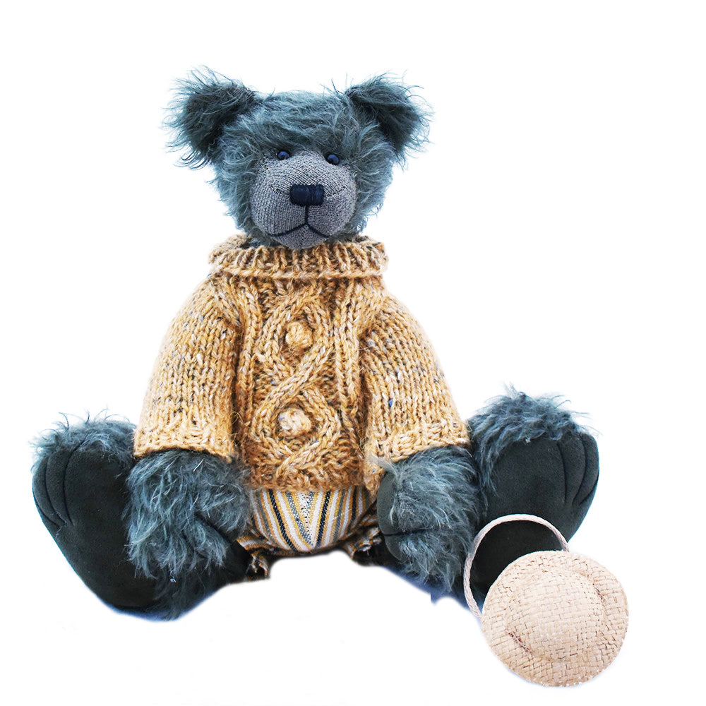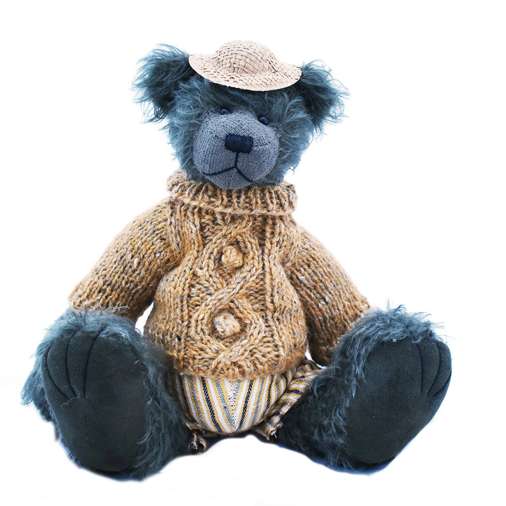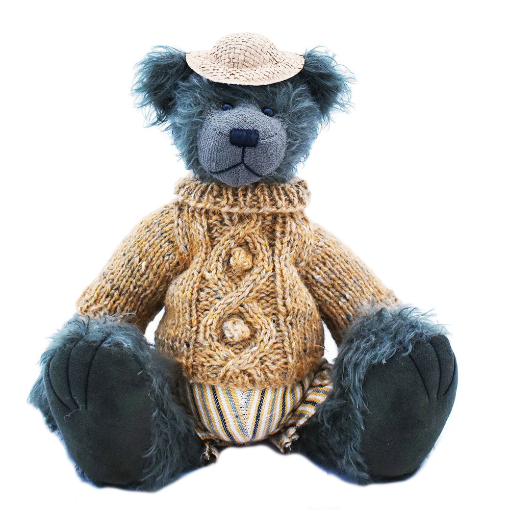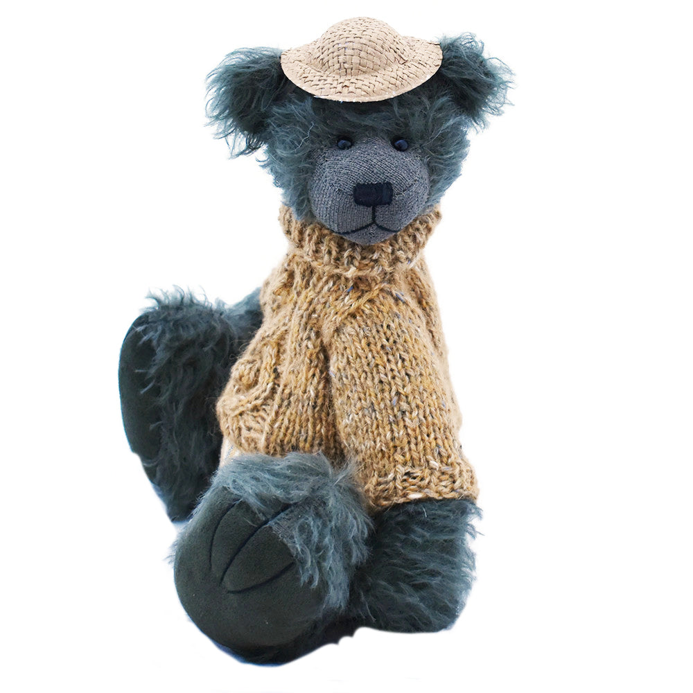 Handmade green sparse German mohair teddy bear, ultrasuede paw pads, black glass eyes, black perle cotton stitched and waxed nose, cotter pin joints, filled with polyester and a little steel shot. Hand knitted jumper and cotton trousers with hat. Free standing.
