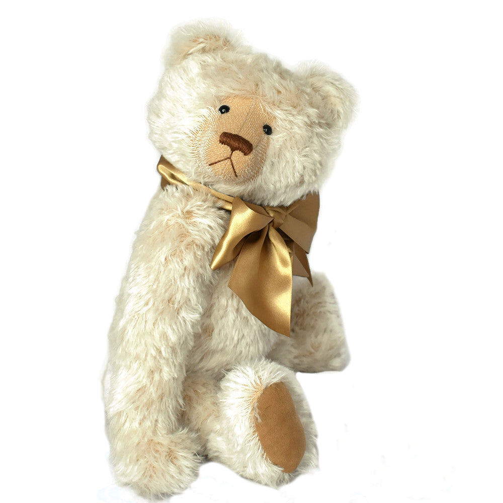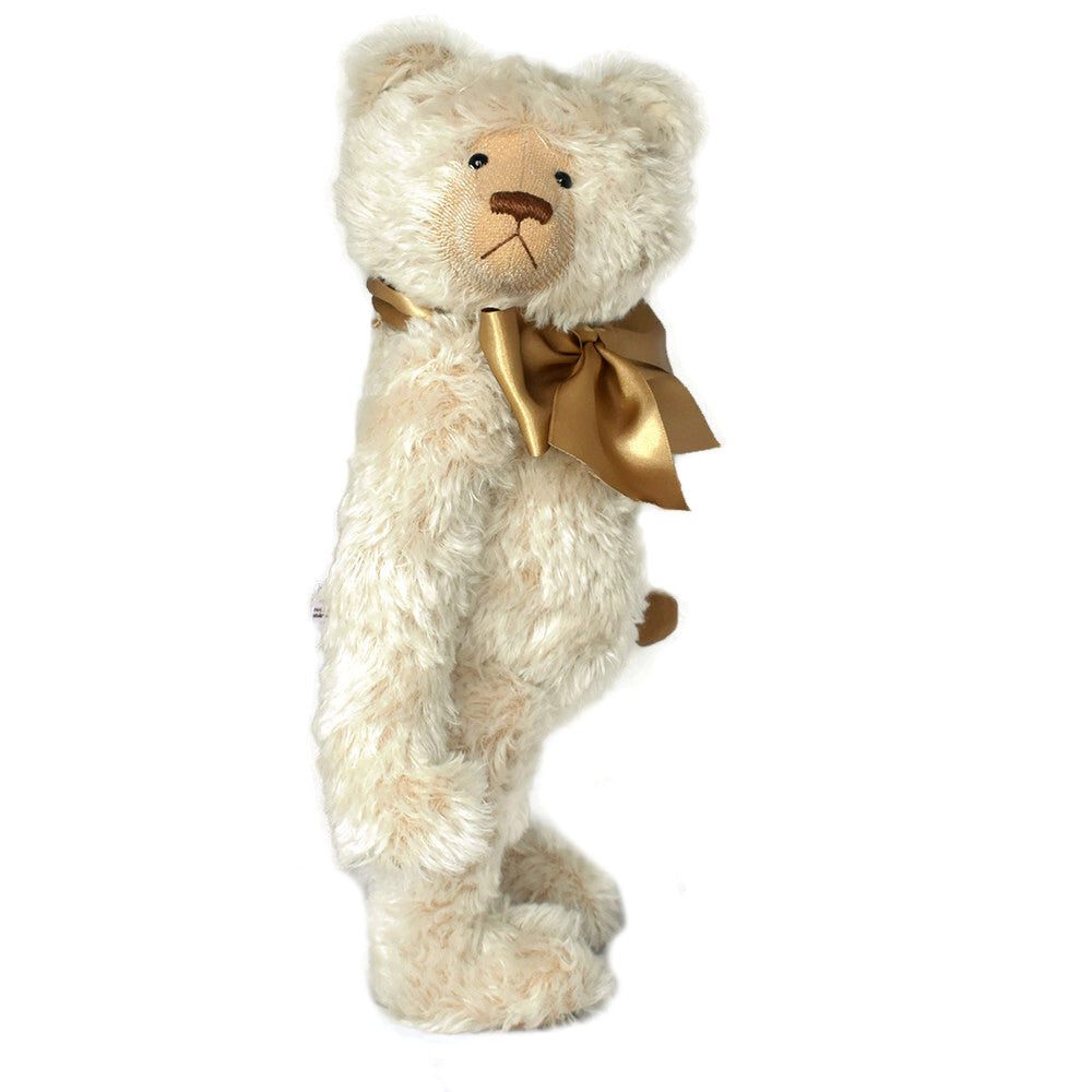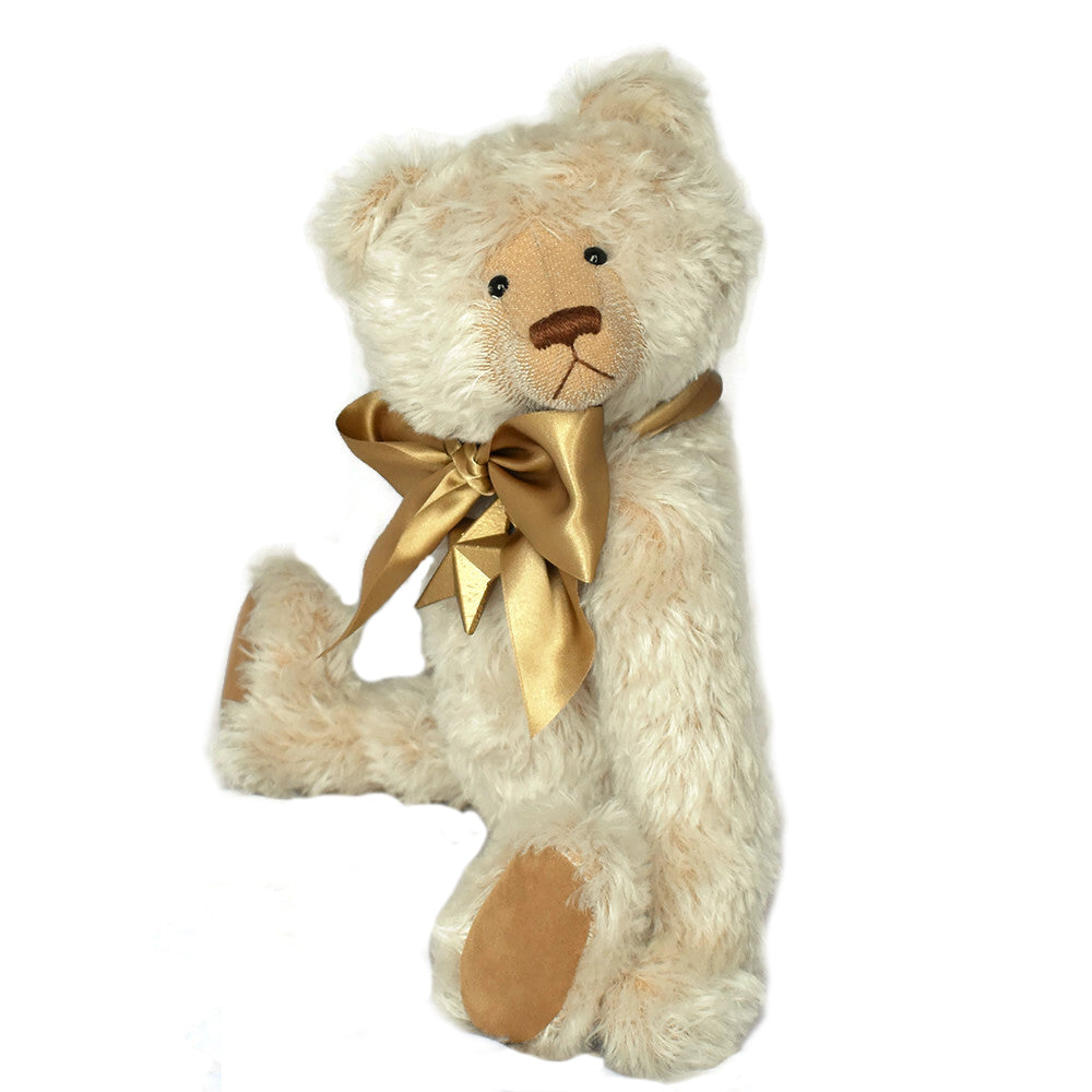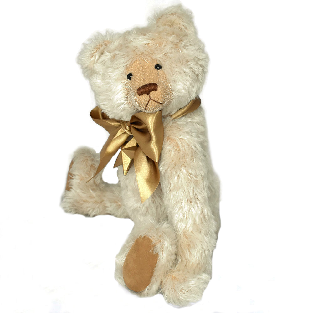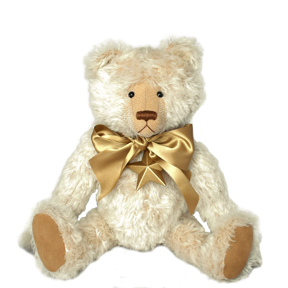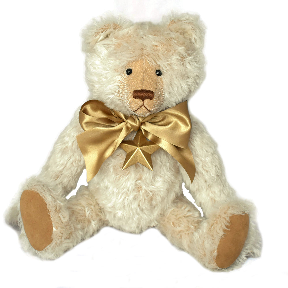 Classic handmade teddy bear created in in off white Steiff Schulte mohair, brown ultrasuede paw pads, black glass eyes, brown perle cotton stitched nose, nut and bolt joints. Filled with polyester and a little steel shot. Gold bow with gold coloured star.