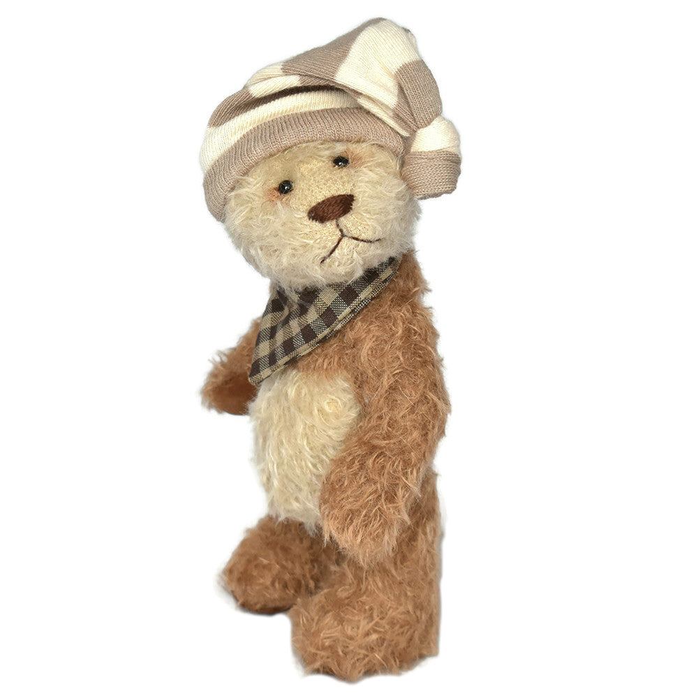Handmade gold and brown sparse German mohair panda bear, suedette paw pads, black glass eyes, brown perle cotton stitched nose, cotter pin joints, filled with polyester and a little steel shot. Woollen checked scarf.