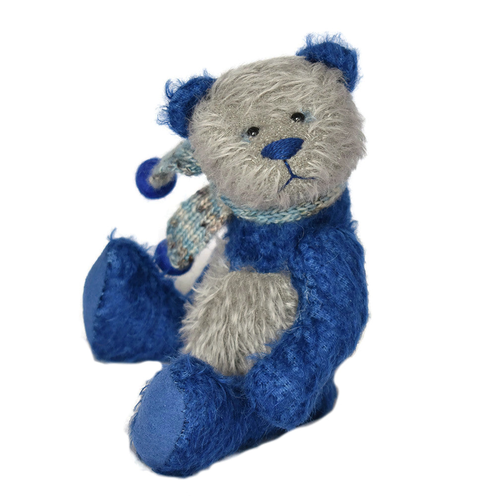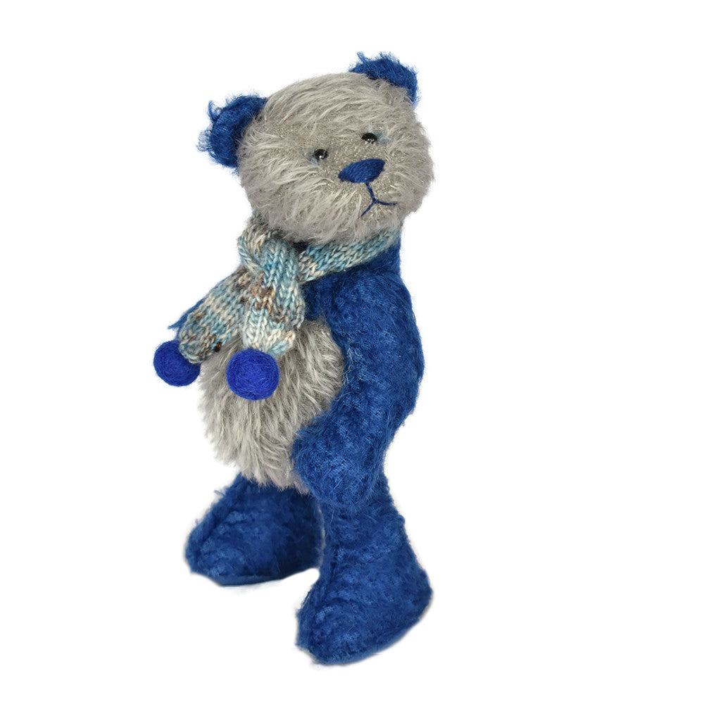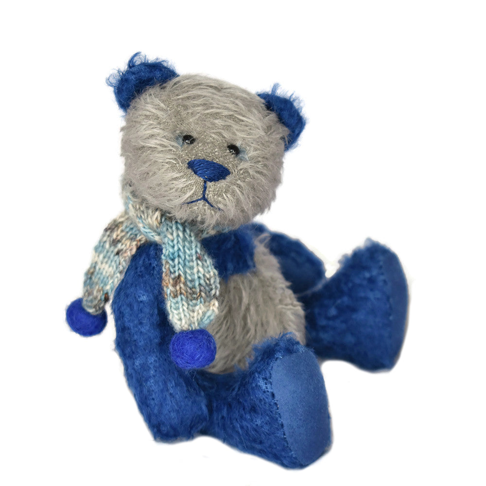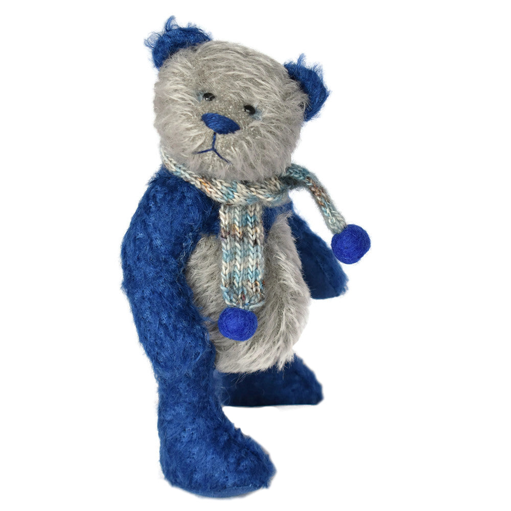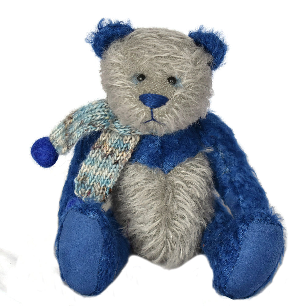 Handmade blue and grey sparse German mohair panda bear, ultrasuede paw pads, black glass eyes, brown perle cotton stitched nose, cotter pin joints, filled with polyester and a little steel shot. Woollen scarf.