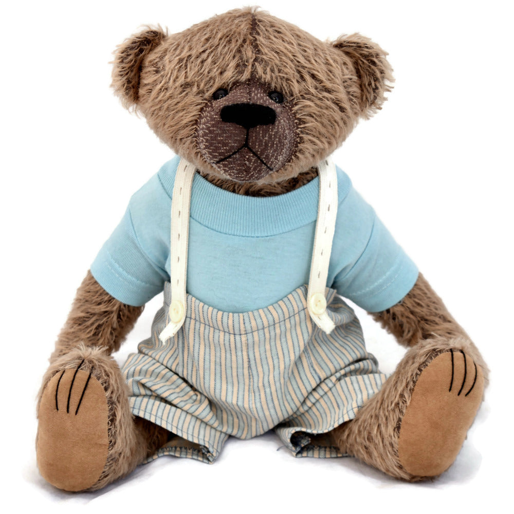 Handmade classic teddy bear in sparse beige Steiff Schulte German mohair with a brown backing ,suedette paw pads, black glass eyes, black perle cotton stitched nose, nut and bolt joints, filled with polyester and a little steel shot. Cotton striped trousers, blue jersey t-shirt with elastic braces. Free standing.